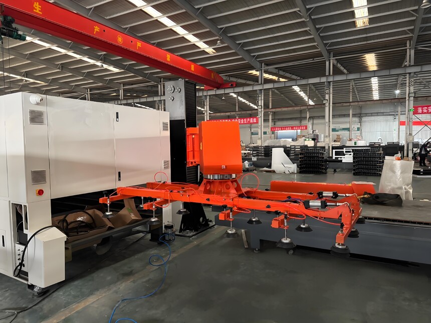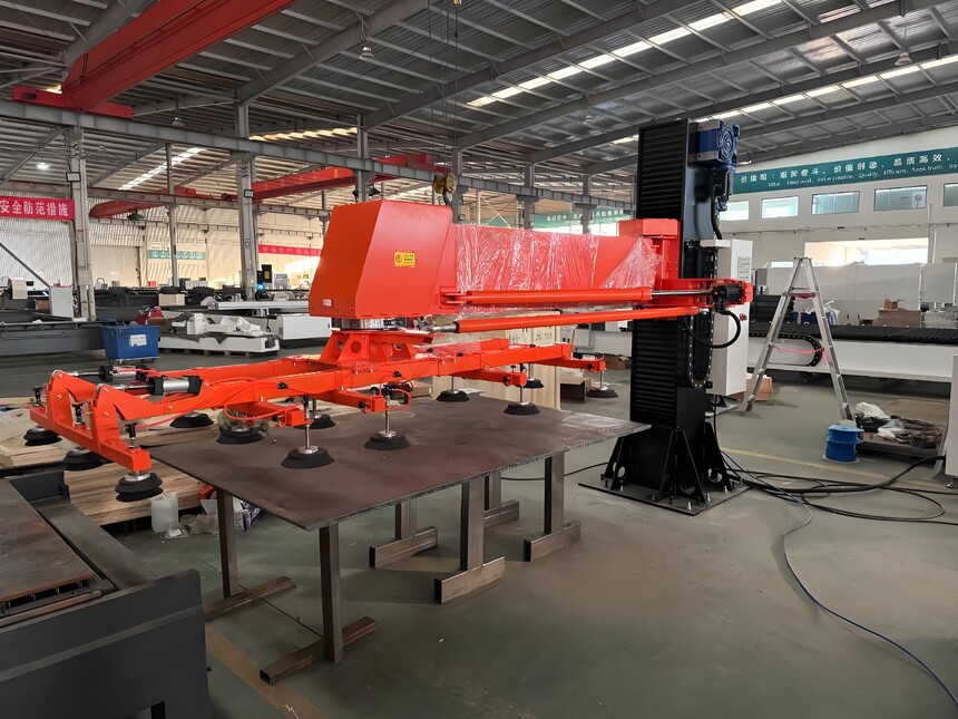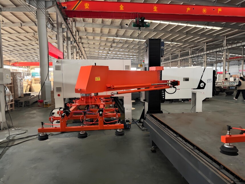 整套设备由摆臂机械手本体、大扭矩伺服同步升降机构、伺服摆臂定位传动、多组重载耐油吸盘(每个吸盘均配置启闭阀)、SNS气动系统、 断电安全保护系统、原装进口欧姆龙数控控制系统及电气系统等组成。 模块化组装结构,灵活轻巧、拆装方便、减少空间浪费。 配备断气保护和自动制动,当突然断电时,板材会保持在原位置不下落,保护人身安全。 人体工学设计,上料操作简单、搬运过程轻松、快捷、连贯、高效。